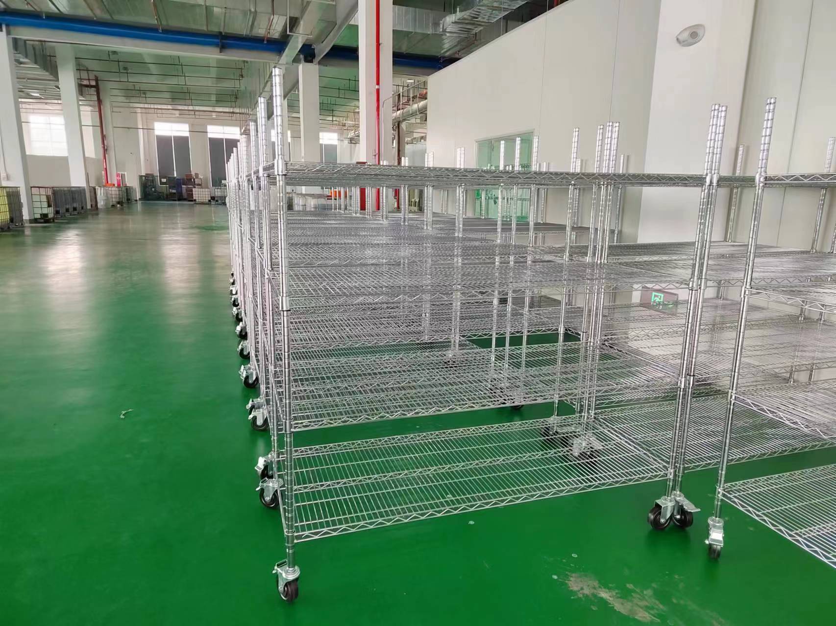 南通某精密電子公司,防靜電置物架驗收結束,每層配置金屬夾片,黑色防靜電腳輪。